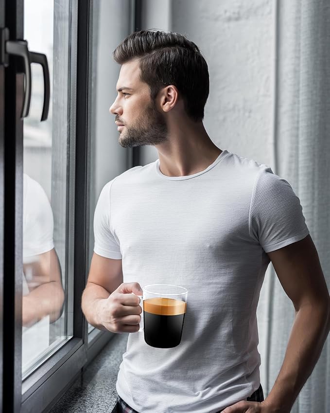 - MULTIFUNCTIONAL GLASS:Modern coffee mug gifts set,these mugs are crystal clear,light weight and the perfect size.Can be used for Capucinno cups,Lungo cups,Macchiato,Latte,Espresso cups,Demitasse cups,Tea,Smoothie,Drinking Glasses,Beers,Hot Chocolate,Mulled Cider and Juice,Perfect for hot or cold Drinks.