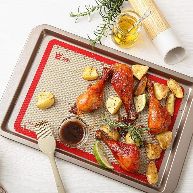 - 100% Platinum Food Grade Silicone Mat: Guanci silicone baking mat has passed the LFGB CERTIFICATION! This means that you can use it with confidence. Because incorporate fiberglass mesh inside of food grade silicone, aside from their nonstick surface, they provide even heat distribution. The baking mat will not produce peculiar smell or smoke at 482°F