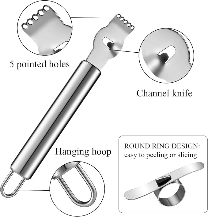- Use easily: with 5 pointed holes and a built-in channel knife, the stainless steel lemon grater zester can meet your needs for lemon slicing and peeling; The citrus peelers stainless steel round ring is designed with a circular hole, helping you to fit the peeler on your fingers, making peeling or slicing more easily