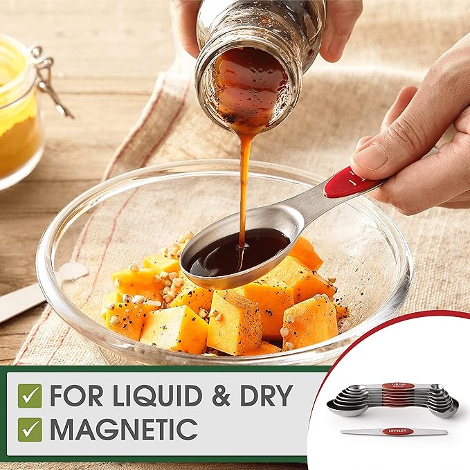 Spring Chef Red Stainless Steel Magnetic Measuring Spoons Set of 8 with Leveler, Dual Sided Nesting Teaspoon & Tablespoon Measuring Spoons, Kitchen Gadgets for Baking & Cooking, Fits in Spice Jars