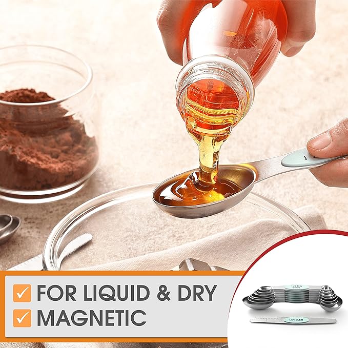 - Magnetic For Easy Use And Storage - These magnetic spoons let you use one spoon at a time and then they nest together for easy storage. Quickly grab the spoon you need without having to fumble with opening and closing a ring. This kitchen measuring set has U.S. and metric measurement markings that are easy to read and won't fade or rub off.