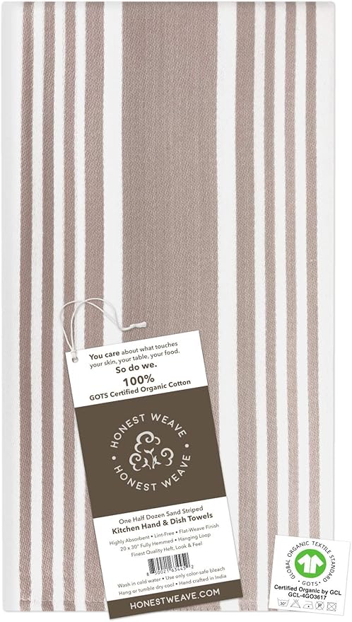 - FEEL GOOD ABOUT YOUR CHOICES! Honest Weave fine kitchen dish towels are made from 100% GOTS certified organic cotton, contain no synthetic material, and each one can help save dozens or even hundreds of trees by replacing the need for paper towels and other paper-based products. We invite you to JOIN US in our commitment to respect and preserve our environment!