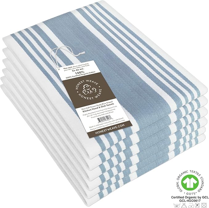 - FEEL GOOD ABOUT YOUR CHOICES! Honest Weave fine kitchen dish towels are made from 100% GOTS certified organic cotton, contain no synthetic material, and each one can help save dozens or even hundreds of trees by replacing the need for paper towels and other paper-based products. We invite you to JOIN US in our commitment to respect and preserve our environment!
