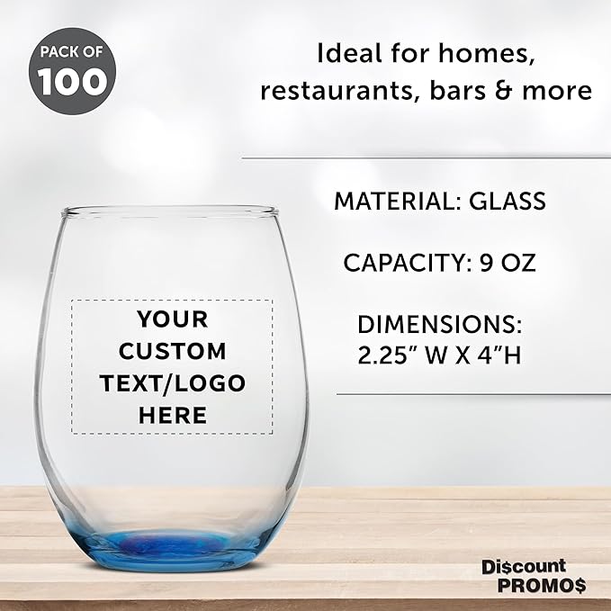 Custom Stemless Wine Glass 9 oz. Set of 100, Personalized Bulk Pack - Great for Wedding Favors, Bachelorette Party Decorations, Party Favors, Color Bottom - Blue