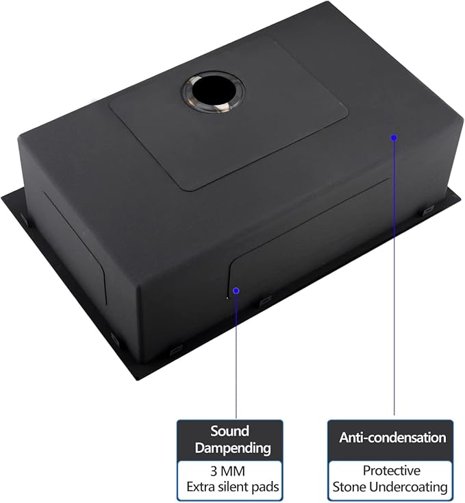- 【Superior Drainage and Sound-Absorption Technology】A sloped base ensures water drains quickly when the job is done, X water guideline drainage for rapid and fluent drainage. The sink also is constructed with heavy-duty padding and undercoating to minimize noise and provide thermal insulation.