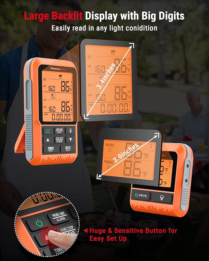 - Large backlit display & simple interface: Large display coupled with a simplistic interface, allows you to operate the device with ease; Probe thermometer for smoker features a unique anti-slip grip to reduce the chance of accidents
