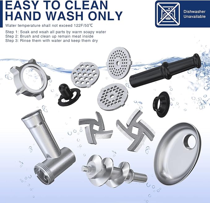 - [Use & Clean Instructions] Easy to operate - after assembling the parts, plug the power supply (Voltage–120V, Frequency–60 Hz ) and press the "on" button, and feeding the food. If something remained stuck, the "REV" button can unclog the unit easily. All parts can be removed and easy to clean. NOT DISHWASHER SAFE! We highly recommended washing the attachments buy hands with water (under 122°F or neutral detergent), and please keep them dry quickly with a towel.
