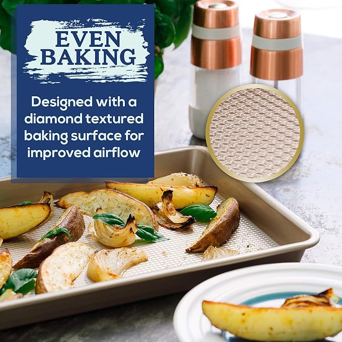 - PERFECT BAKING, EVERY TIME: Even airflow distribution from the half sheet pan’s diamond textured baking surface results in perfect, evenly-baked cookies, proteins, and more; exterior measures 17.8 x 12.8 x 1.1 inches and interior measures 17.4 x 12.4 x 0.9 inches; that means better baked goodies every time