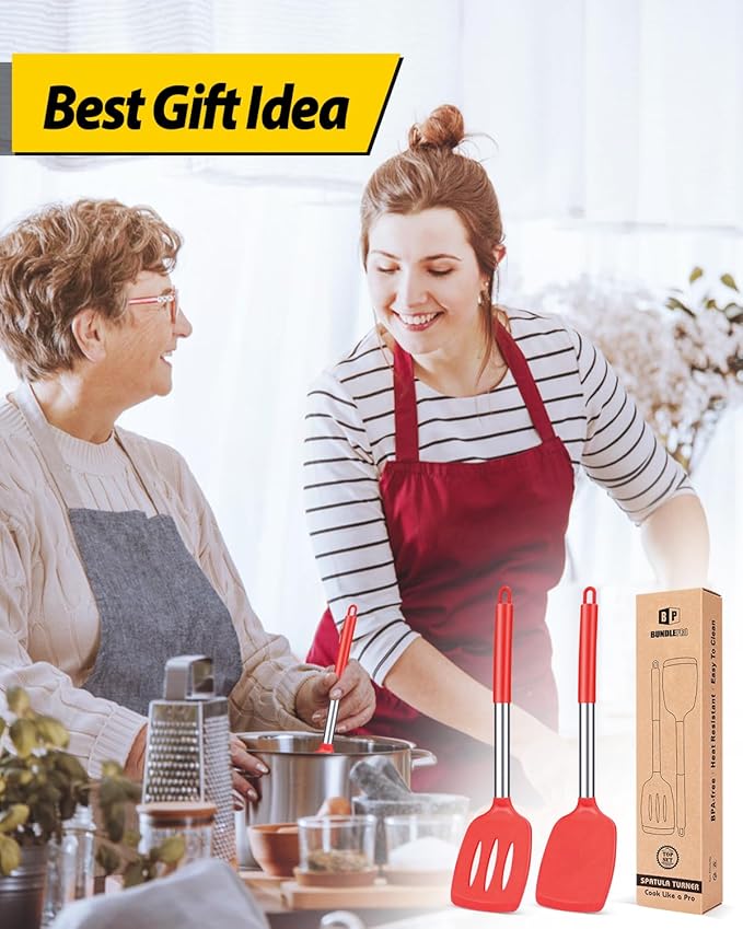 Pack of 2 Silicone Solid Turner, Non Stick Slotted Kitchen Spatulas, High Heat Resistant BPA Free Cooking Utensils, Ideal Cookware for Fish, Eggs, Pancakes(Red)