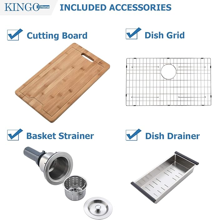 - ACCESSORIES INCLUDED --- Bamboo Cutting Board, Bottom Rinse Grid, Stainless Steel Colander, Basket Strainer Drain Assembly, Kitchen Sink. Mounting Clips and Installation Guide are included for an easy installation. 30 days return and money back guarantee, 3 Years Limited Warranty.
