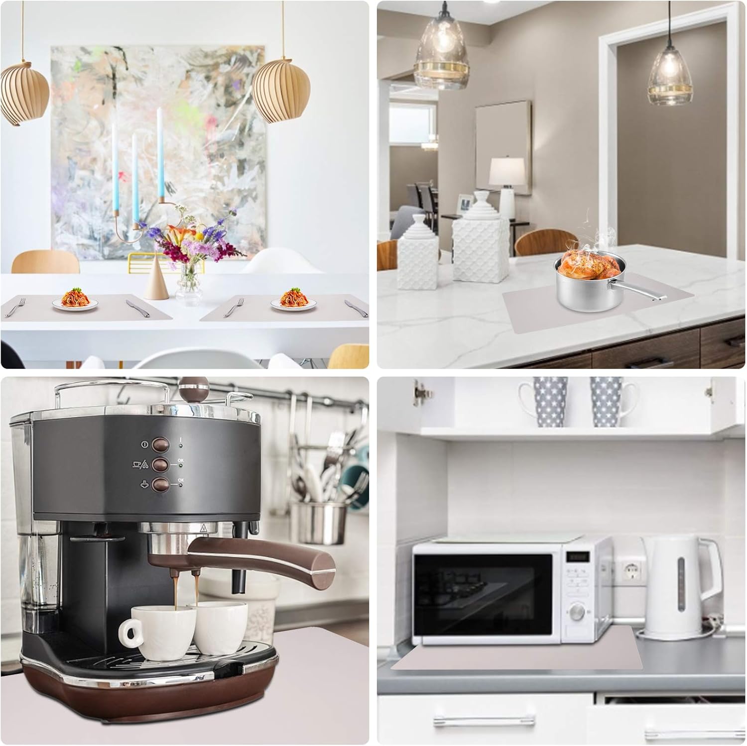 - Countertop Protector : The multipurpose silicone mat can be used as placemats, pot holder, dish mats, tableware, trivet, drains, heat insulated pads to protect the kitchen countertops and other surfaces against spills, scratches, grease, heat, etc.