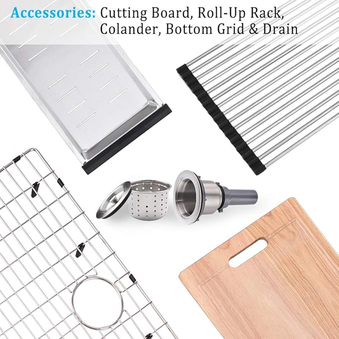 - Workstation Undermount Sink Design: The workstation sink with single track - ledges on the front and back provide a track for sliding the built-in accessories, include placement of solid wood cutting board, stainless steel colander and roll-up dish drying rack, saving more workspace