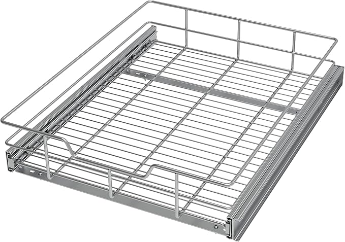 - Durable High Strength Reliable: Wire mesh made of high quality steel, underneath the drawers with 3 cross bars for supporting the heavy weight, even under the weight of heavy portable equipment this wire basket slide shelf will not sagging and bending. Industrial grade ball sliding system make our cabinet pull out shelve can handle up to 100 lbs. The chrome finish on the pull out organizer makes them increase hardness, wear resistance, corrosion resistance, and easy to clean.