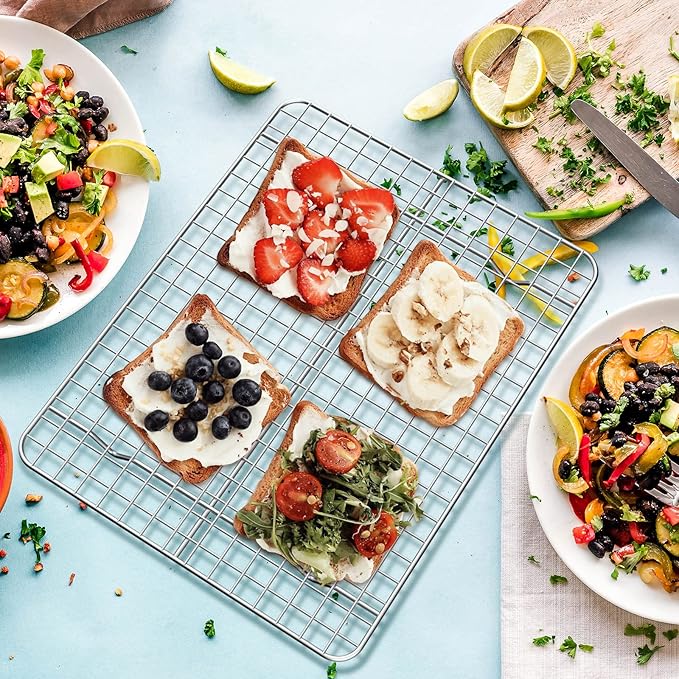 - š [VERSATILE BAKEWARE KIT] The oven pans and baking racks are great for using separately or together. Perfect for baking cookies, breads, bacon, steaks, vegetables, ribs, chicken wings, drumsticks, brownies, pizza and more. The wire racks fit perfectly inside the pan to avoid foods falling through, weld firmly with dense parallel lines allow fast and even air circulation for baking or cooling.