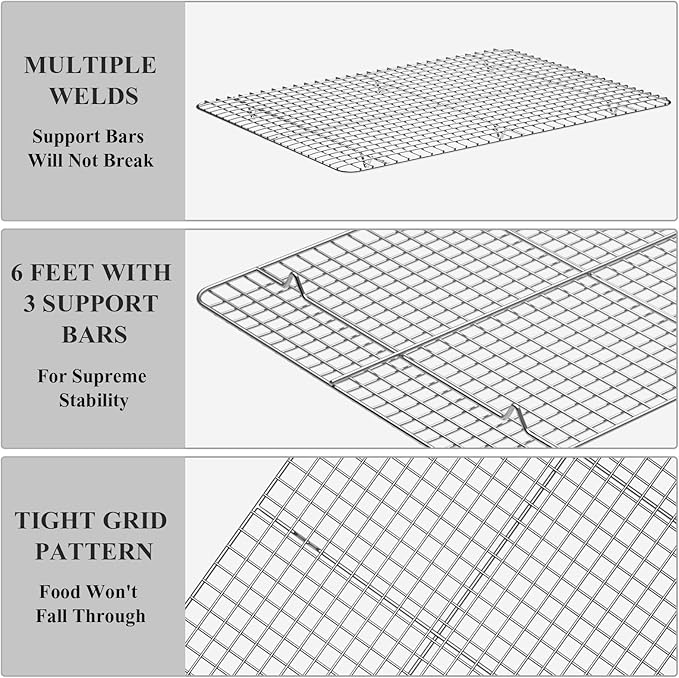 - š [SOLID CONSTRUCTION] Thick gauge with sturdy construction, these heavy-duty half sheet pans have a reinforced, rolled edge that provides extra strength to help resist warping in the oven. The cooling racks with raised feet facilitate air circulation for evenly baked goods. Feel sturdy and solid in hands, durable for serving many years.