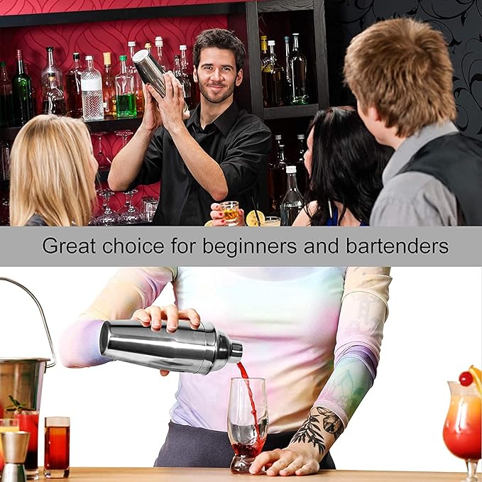 - Begin your career as a hobby mixologist with this cocktail shaker: Works like a charm and doesn't leak, this cocktail shaker set includes: shaker cup (24 oz/750ml), airtight lid, built-in strainer, two-sided measuring jigger (1.0 oz & 0.5 oz) and an elegant bar spoon. This martini shaker will help you create the best cocktails, martini and new drink recipes.