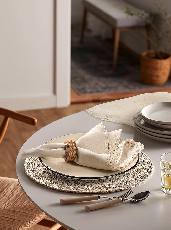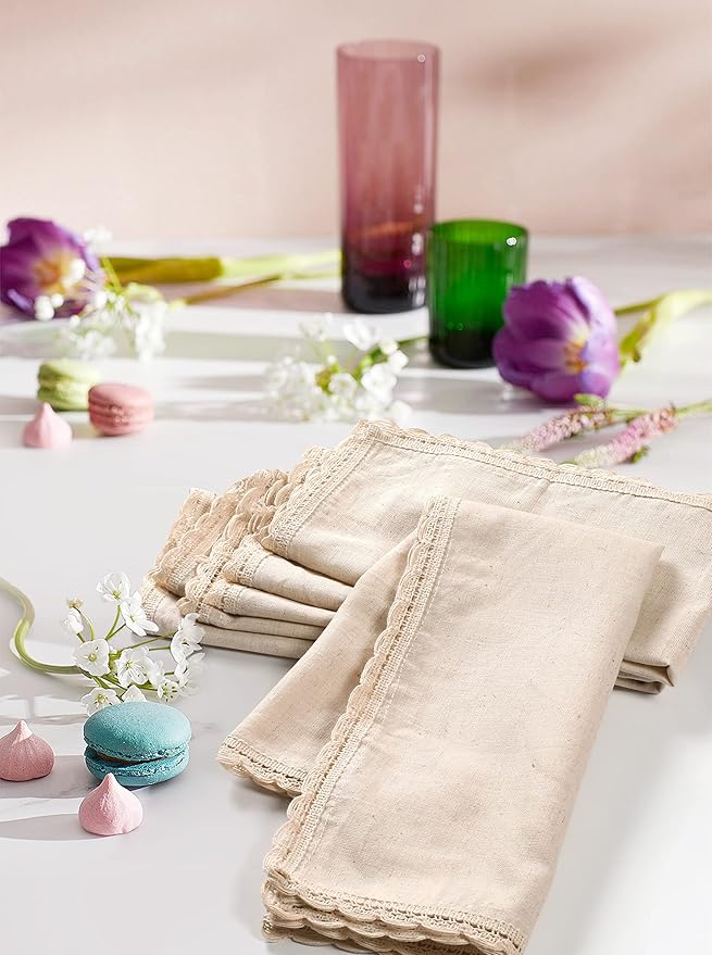 Hausattire Cloth Napkins 12 Pack 20x20 Inches Flax Cotton Washable and Reusable Table Dinner Napkins with Lace for Hotel,Weddings,Thanksgiving Decor| Highly Absorbent Cloth Napkins|Natural