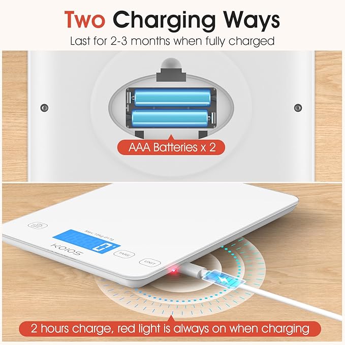 - [Battery & Type-C Charging] Powered by Type-C port and comed with 2 AAA batteries, you have more choice for charging. Press once to turn on, long press 3s to turn off. Kitchen scale turns off automatically if the displayed weight remains unchanged for 3 mins.