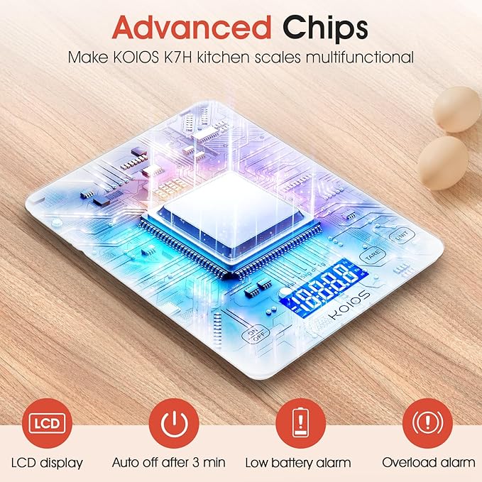 - [Precise Weight & Sensitive Sensors] Built-in four sensitive load sensors, upgraded K7H digital food scale can give you accurate weighing within a short time. Adopts anti-slip design, it improves safety and stability. Range of measurement: 0.1oz to 33lbs (3g to 15 kg). 1g or 0.1oz increments when adding ingredients.