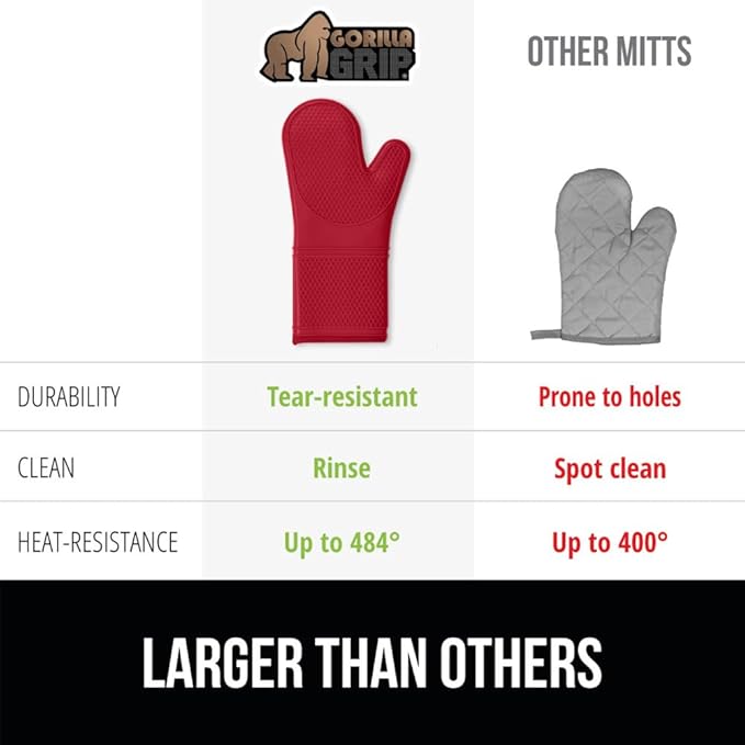 - WATERPROOF AND STAIN RESISTANT: no more constantly stained oven mitts; Gorilla Grip Silicone Mitts are both stain resistant and waterproof; spills can easily and instantly be rinsed away under water; hot liquids won’t soak through and scald your skin as they would with other materials