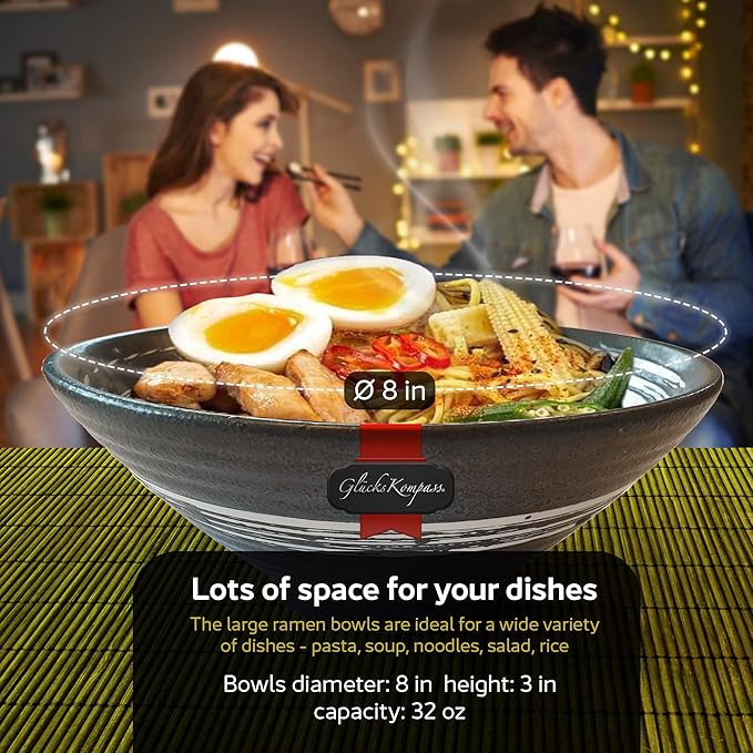 - QUALITY & SERVICE: This set impresses with its design and quality and is manufactured with the utmost care so that you are completely happy. If something is not to your full satisfaction - contact us and we will take care of it - quickly and easily. DELIVERY: Set of 2 (8 pieces): ramen bowls (ceramic), ramen spoons (ceramic), chopsticks, chopstick rests (ceramic). Sizes: 8 inches diameter, 3 inches height, 32 oz (1 quart) capacity.