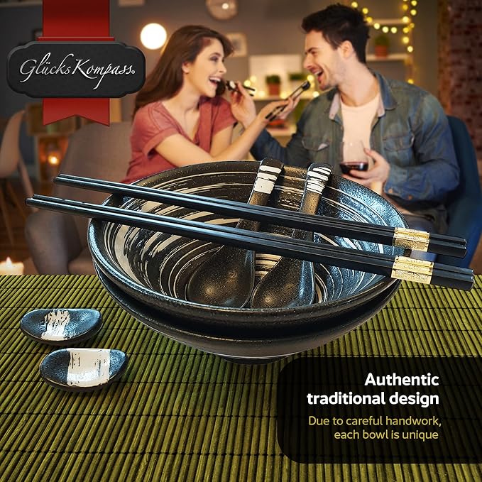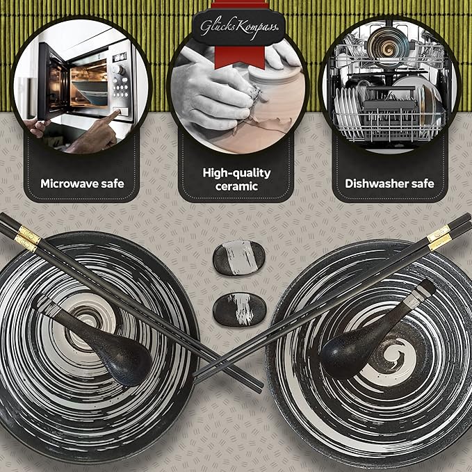 - Enjoy your ramen and soups in the authentic Japanese GlücksKompass Ramen Bowl Set. Experience the urban lifestyle, feel the serenity and balance and be one with yourself. The elegant, meticulously coordinated set consists of two ceramic bowls, two ceramic ramen spoons, two pairs of elegant chopsticks and, as the icing on the cake, two ceramic chopstick rests. With its original black and white swirly pattern, this set will bring you joy and contentment.