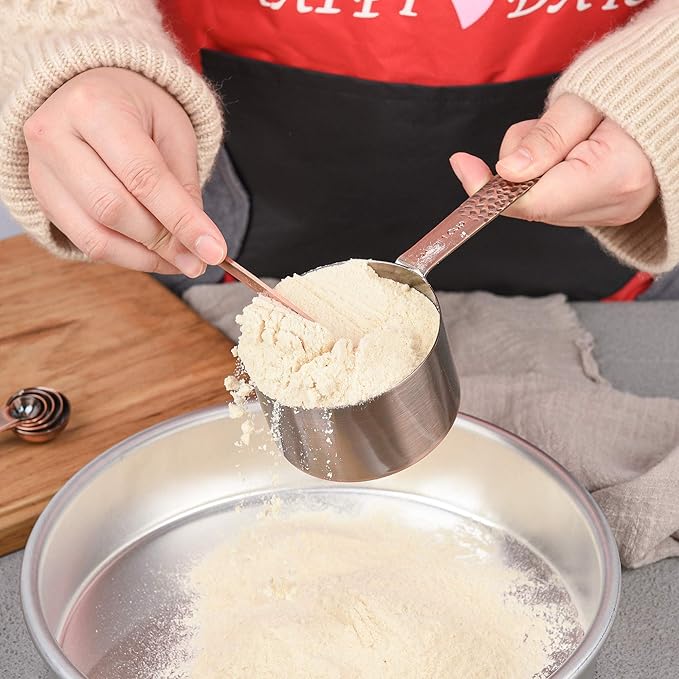 - ✱✱Every copper measuring cup and spoon in this set has the accurate measurements size in US and Metric engraved on the handle clearly, what will help you reduce any measuring errors for cooking or baking! Easy to read and never wipe off.