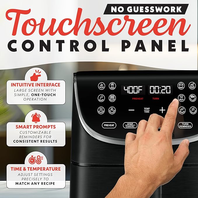 - Preset Variety – 12 One-Touch Functions : Air fry, bake, roast, broil, or dehydrate at the press of a button.