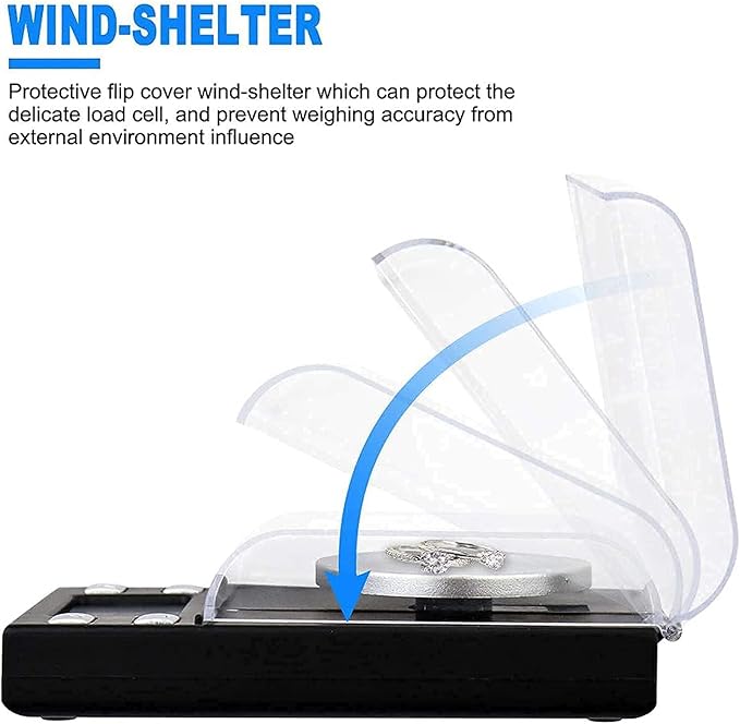 - 【Advanced Design】: High precision gold scale is designed with a stainless steel platform and a protective flip cover wind-shelter which can protect the delicate load cell, and prevent weighing accuracy from external environment influence. This electronic smart mini scales would be great as a lab scale, scientific scale,jewelry scale, powder scale, reloading scale,micro scale. The LCD screen with backlit clearly displays the reading even in dark