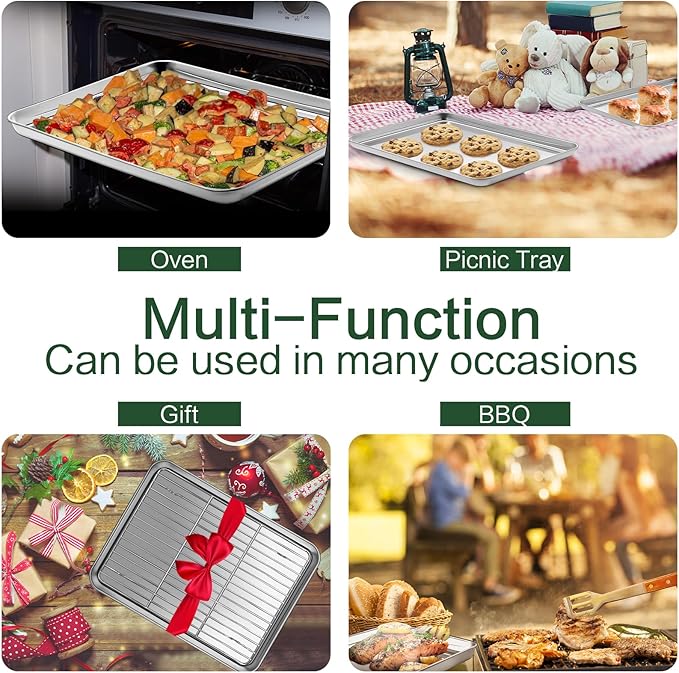 - Excellent Crafted & Heavy Duty : The baking tray with wire rackt comes with sturdy construction and reinforced edge, which is prevent twisting and warping and heat up evenly reducing baking time. The baking pan has an excellent mirror polished, reducing the risk of food adhesion. The smooth edge of baking tray won't cut your hand