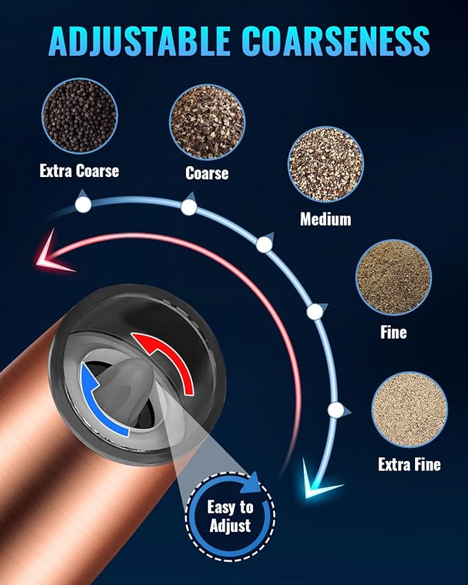 XinXu Gravity Electric Pepper/Salt Grinder, Salt or Pepper Mill, Adjustable Coarseness, Battery Powered with LED Light, One Hand Automatic Operation (Single/Copper)