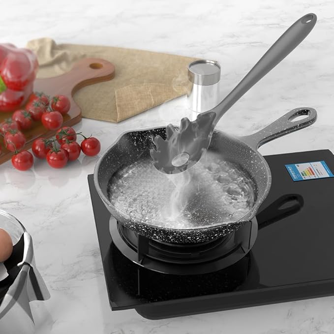 - Nonstick Cookware Friendly: The thickened silicone head of this silicone kitchen utensils set is soft and elastic; ideal for silicone utensils for cooking with nonstick pans; makes close contact with the pan surface without scratching the nonstick coating; thus extending the pan's service life; the silicone handle with moderate size offers a comfortable grip and blocks heat transfer; making it easy to flip; strain dishes or serve soup