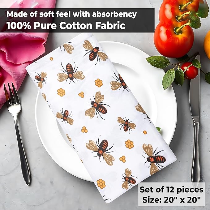 Urban Villa Dinner Napkins Honey Bee Print Cloth Napkins (Set of 12) Oversized 20x20 Inches 100% Cotton Premium Quality Soft Durable with Mitered Corners Reusable Washable Everyday Use Parties Napkins