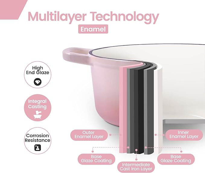 - Suitable for 6-7 people: The 5.5 quart enamel Dutch oven is the choice for cooking food and desserts. Its design makes your food look more delicious