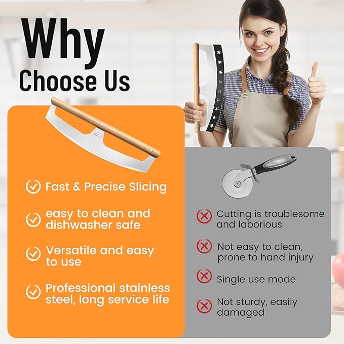 - [PREMIUM QUALITY] - Made of food grade 430 stainless steel blade and PP cover, the Pizza Rocker Knife is incredibly sharp, the whole steel plate is integrated to make no welding, no falling off, not easy to deform and rust.