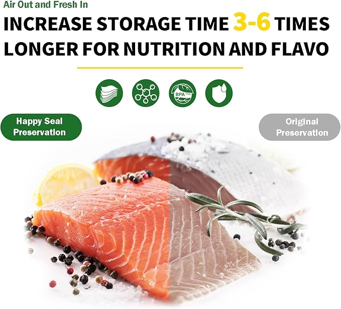 - Keep Food Fresh: Happy Seal vacuum sealer bags rolls with embossed channels to increase suction, which creates an airtight barrier around foods, lock freshness, flavor and nutrition inside. 3-6 times longer food shelf life than before use.