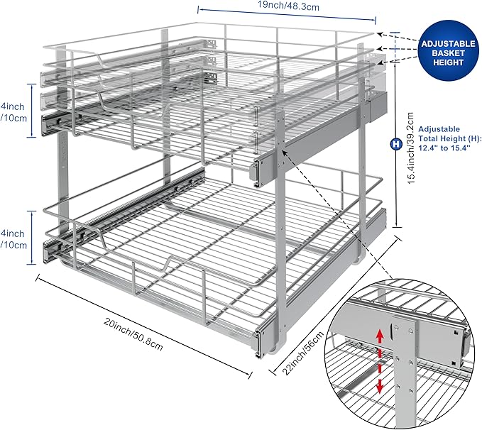 2 Tier Pull Out Cabinet Organizer 20" W X 22" D, Slide Out Drawers For Kitchen Cabinets, Pull Out Drawers For Cabinets Capacity Heavy Duty Caddy, Cabinet Pullout Shelves Chrome-Plated,Bathroom Pantry