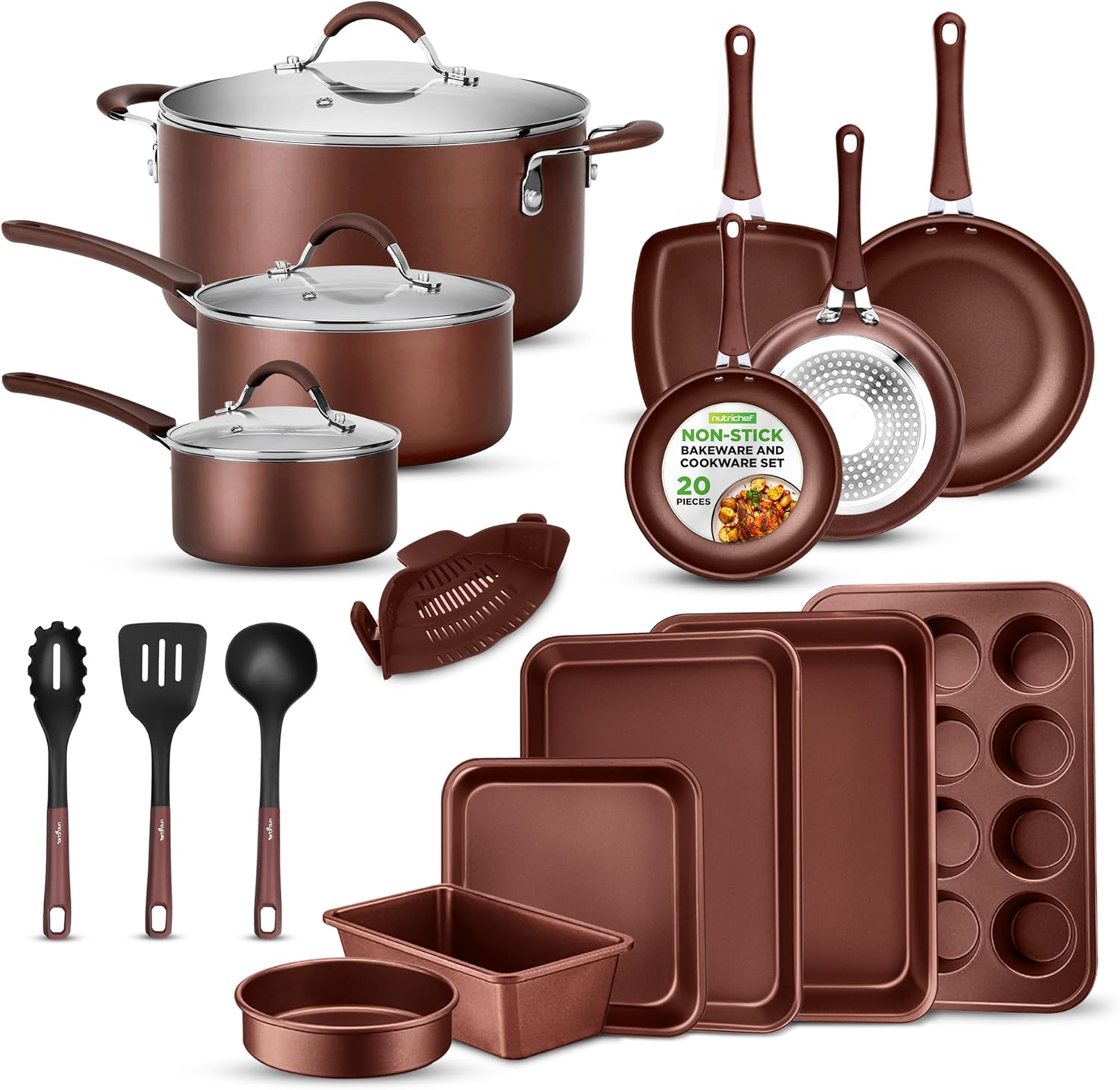 - 20-PIECE SET: NutriChef 20-piece nonstick cookware set includes (6) bakeware set, 3 nylon utensils, silicone drainer, 8" 10" 12" open fry pan, 1.5 qt & 2.5 qt sauce pot w/ lid, 5 qt stew pot w/ lid, 9.45" grill pan, soup ladle, pasta fork, & spatula