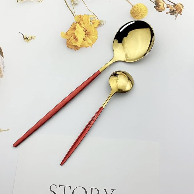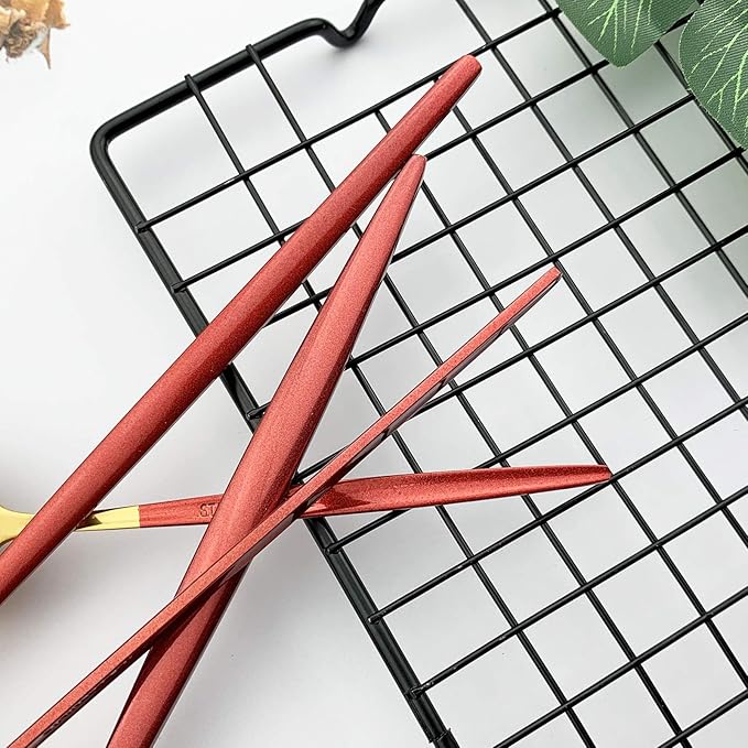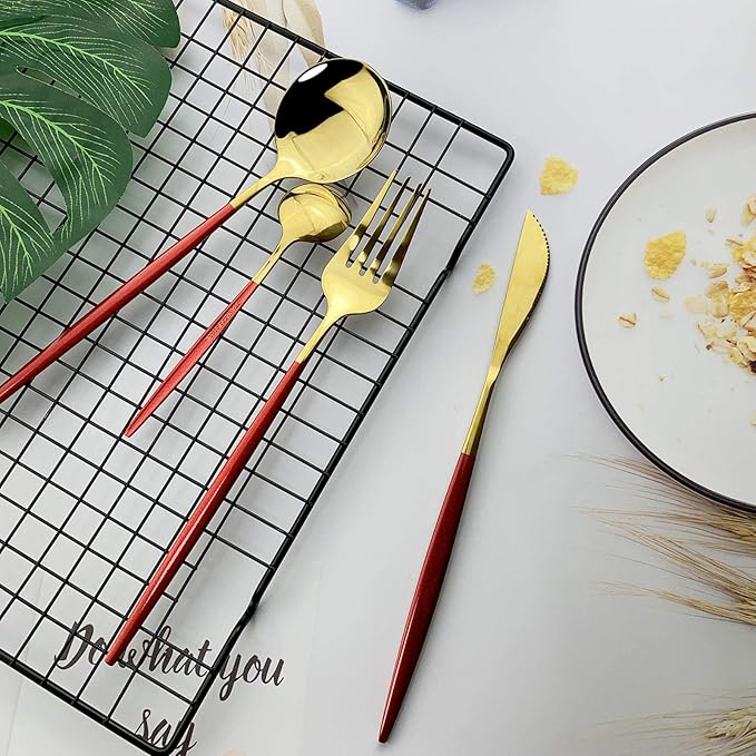 JASHII Flatware Serving Set 24 Piece, Stainless Steel Silverware Set, Red Gold Cutlery Set, Modern Elegant Tableware Set for Party, Christmas, Dinner (Red Gold)