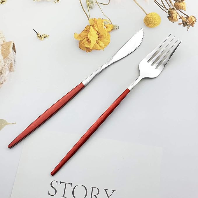 JASHII Flatware Serving Set 24 Piece, Stainless Steel Silverware Set, Red Silver Cutlery Set, Modern Elegant Tableware Set for Party, Christmas, Dinner (Red Silver)