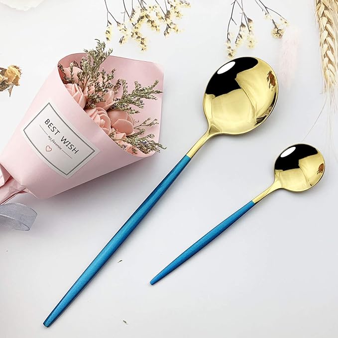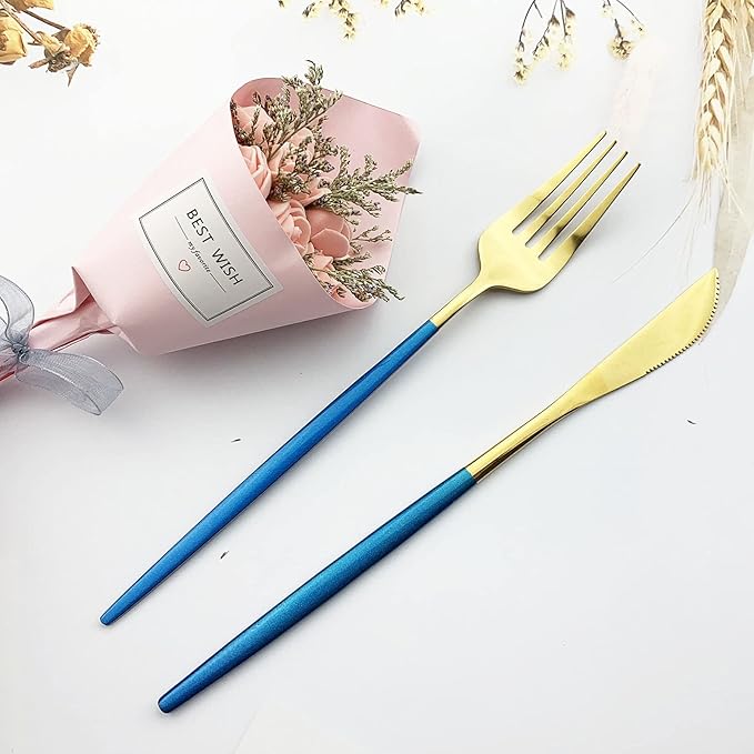 JASHII Flatware Serving Set 24 Piece, Stainless Steel Silverware Set, Blue Gold Cutlery Set, Modern Elegant Tableware Set for Party, Christmas, Dinner (Blue Gold)