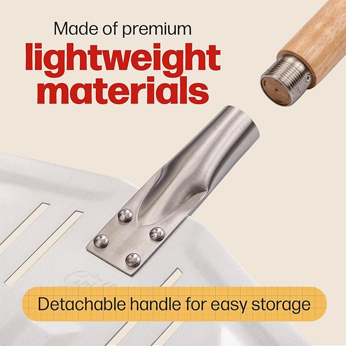 - PREMIUM QUALITY: Made from premium grade Anodised Aluminium, with a turned beechwood handle for comfortable and safe handling. Our pizza peels are made to last, meaning you can launch and retrieve delicious home made pizzas again and again.
