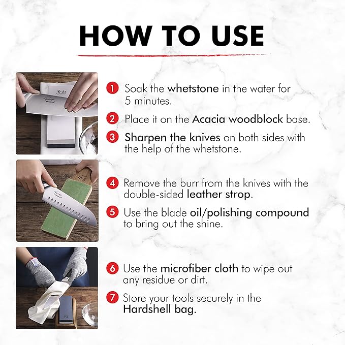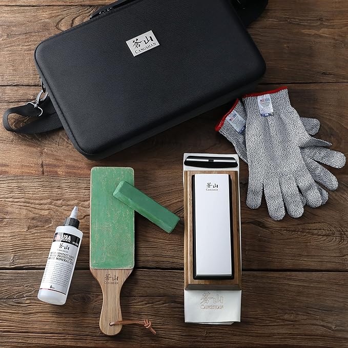 - Set Includes: double sided whetstone, acacia wood base, 16-degree knife sharpening guide, 6 oz knife blade oil, double sided genuine leather strop, 6 oz fine grit polishing compound, microfiber cleaning cloth, pair of cut resistant gloves, and hard-shell storage bag.