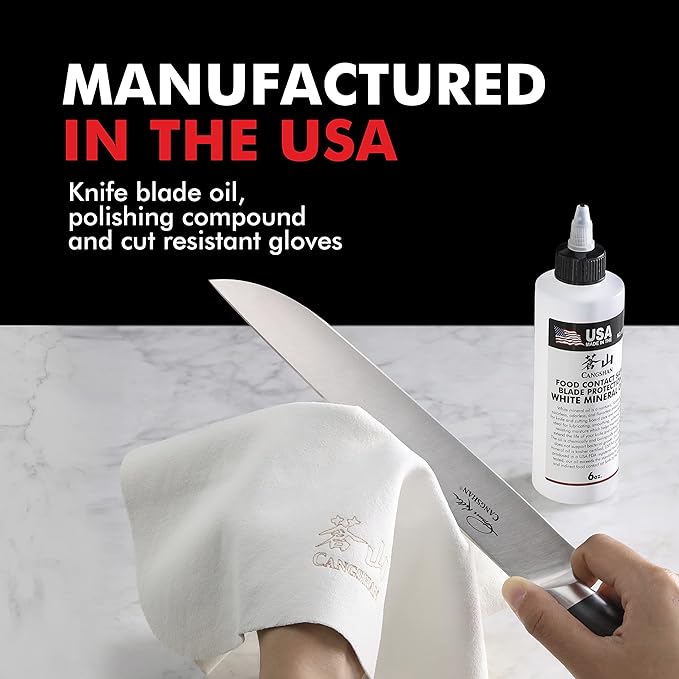 - Knife blade oil, polishing compound and cut resistant gloves all manufactured in the USA