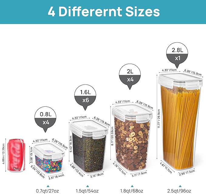 - 4 Size Combinations Fit Your Needs----Our kitchen storage containers set comes in 4 different sizes. Includes 1 Tall Container (2.5quart/2.8 liters), 4 Large Containers (1.8quart/2.0 liters), 6 Medium Containers (1.3quart/1.4 liters), 4 Small Containers (0.7quart/0.8 liters). Perfect for storing spaghetti, baking supplies, cereal, flour, sugar, oats, pasta, rice, coffee, tea, snacks, nuts and other dry goods.