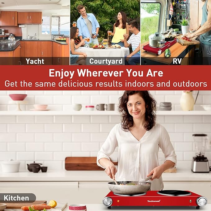 - [ MULTI PURPOSE & INTIMATE DESIGN] - Techwood electric hot plate is perfect for all kitchens for its easy control, never goes out of style stainless steel surface and dual crystallite glass design. Especially ideal for dorms, offices, camping, RV/caravans, holiday homes, daily use or entertaining, or as an extra cooking appliance in the busy kitchen for its compact size.