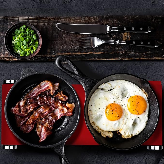 - [ SUPERIOR TEMPERATURE TECH] - The thermostatic knobs of the plate control the separate temperature of the burner, allows you cooking food including scrambled eggs, frying fish, simmer soup, warm sauces, melt chocolate, grilled cheese, boil water, cook pasta and do so much more by choosing desired temperature. With overheat protection, the burner automatic safety cycles on/off.