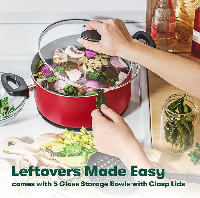 BELLA Cookware Set, 12 Piece Pots and Pans with Utensils, Nonstick Scratch Resistant Cooking Surface Compatible with All Stoves, Nylon and Aluminum, Red