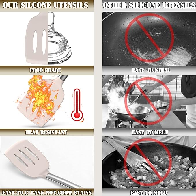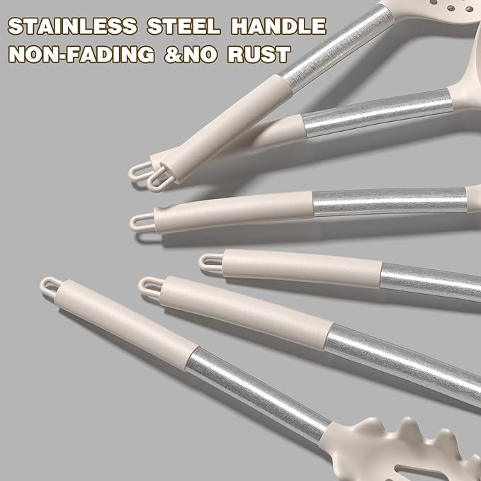 - SAY GOODBYE TO SHORTCOMINGS OF MOST KITCHEN UTENSILS & LONG-LASTING: Our kitchen utensils are designed in large sizes, not those ordinary kitchen utensils that look like toys. The high-quality non-rust stainless steel handle increases firmness, and no longer breaks or bends, The anti-scalding silicone sleeve on the handle prevents the chef's hand from being scalded. The firm welding will not cause the silicone head to fall off, Seamless design provides convenience to cleaning