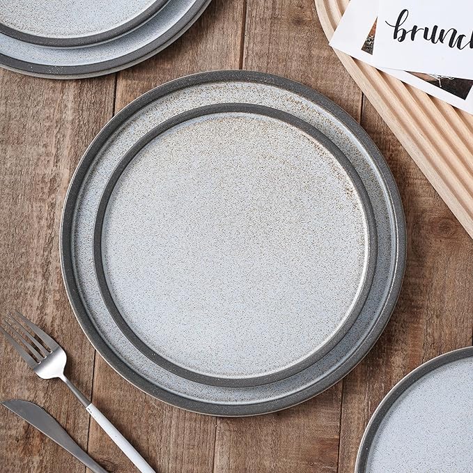 - RUSTIC AND EARTHY STONEWARE - For casual dining, this unique grey dishware is the perfect touch to your rustic kitchen and is sure to make a statement in your home. The modern low profile plates allow the entire surface area of the plate to be used for plating food.